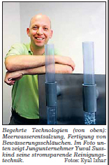 Yuval Susskind ist einer der hoffnungsvollen Jungunternehmer in dem Zentrum. Er entwickelt eine energiesparende Abwassertechnik. Wie das funktioniert, führt er anhand von zwei etwa 1,5 Meter hohen, mit Wasser gefüllten Glasröhren vor. In beiden Röhren steigen kleine Luftbläschen von unten nach oben. Sauerstoff ist wichtig, um Abwasser von organischen Resten zu befreien. Je länger der Sauerstoff im Wasser gehalten werden kann, desto mehr Abfall wird abgebaut. Hier setzt Susskinds Firma Diffusaire an: Während die Luftblasen in der linken Röhre einfach von unten nach oben steigen, pumpt die Anlage in der rechten Röhre den Sauerstoff von oben und unten gleichzeitig in die Röhre. Die Luftbläschen bleiben auf diese Weise länger im Wasser. „Etwa 1,5 Prozent des Stroms weltweit wird für die Klärung von Abwasser verbraucht“, sagt Susskind. „Wir sparen mit unserer Technik bis zu 25 Prozent dieser Energie ein.“
