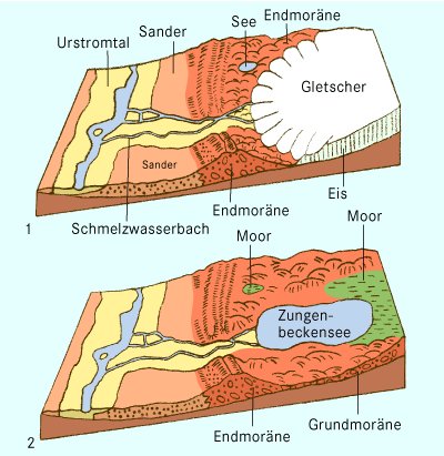 Die typische Abfolge von Gundmoräne mit Zungenbeckensee, Endmoräne und