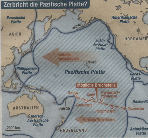 Der Boden des Pazifischen Ozeans zerbricht. Die größte tektonische Platte der Erde beginne, sich nahe des Äquators von Ost nach West zu spalten, berichten zwei Geologen aus Chile. Der Meeresboden sei so stark unter Druck, dass er aufreiße. Der Pazifikboden bewegt sich im Norden schneller als im Süden. Dort wird er an seinen Rändern, wo er unter die Nachbarplatten abtaucht, stärker gebremst als im Norden. Wie bei einem Papier, das auf seiner unteren Hälfte festgehalten und oben geschoben wird, baue sich in der Mitte daher große Spannung auf, schreiben Valérie Clouard und Muriel Gerbault von der Universität Santiago im Fachblatt Earth and Planetary Science Letters (Bd. 265, S. 195, 2008). Die neue Teilungslinie im Pazifik würde die Erdplatten-Bewegungen neu ausrichten. Der Meeresboden schöbe sich von der neuen Bruchzone aus nach Nord und Süd. Im Norden gelangte er unter den Nordamerikanischen Kontinent. In der Tiefe bildete sich Magma – Kalifornien würde zur Vulkanlandschaft.